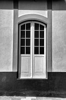 Hoge deur met een mooie boog, eigenlijk twee deuren die naar binnen opengaan in de stenen huis om wat frisse lucht te brengen. Mooie zonnige dag. Zwart-wit beeld.