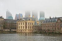 De hoge gebouwen achter Het Binnenhof en Het Mauritshuis in Den Haag verdwijnen in de lage bewolking.