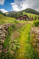Hohlweg Gasse en bergboerderijen boven Innervillgraten, Villgratental, Oost-Tirol, Tirol, Oostenrijk