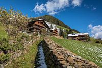 Holle weg met oude bergboerderijen in Innervillgraten, Villgratental, Oost-Tirol, Tirol, Oostenrijk