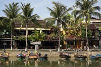 De rust van de rivier weerspiegelt perfect de gevels, lantaarns en palmbomen en accentueert de sereniteit van de plek. Deze hoek van Hội An, die vooral 's avonds levendig is, straalt een ochtendrust uit die perfect is voor een wandeling. Het is een gebied waar cultuur, geschiedenis en natuurlijke schoonheid samenkomen en dat getuigt van het handelsverleden van de stad.