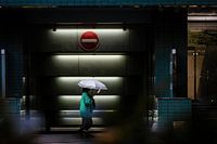 Een vrouw die haar paraplu omhoog houdt loopt voor een kleurrijk in-,uitgang langs.