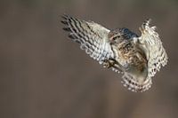 Koop de foto Holenuiltje in de vlucht met gespreide vleugels. van Albert Beukhof op canvas, aluminium dibond, (ingelijste) fotoprint, behang en ArtFrame, op maat geprint in Fine-Art kwaliteit.