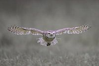 Dit holenuiltje vliegt vlak over het gras om daar te gaan landen. Vermoedelijk heeft hij een prooi gezien waar hij op af vliegt.