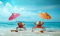 Twee krabbetjes met rieten hoedjes en papieren parasolletjes op het strand.