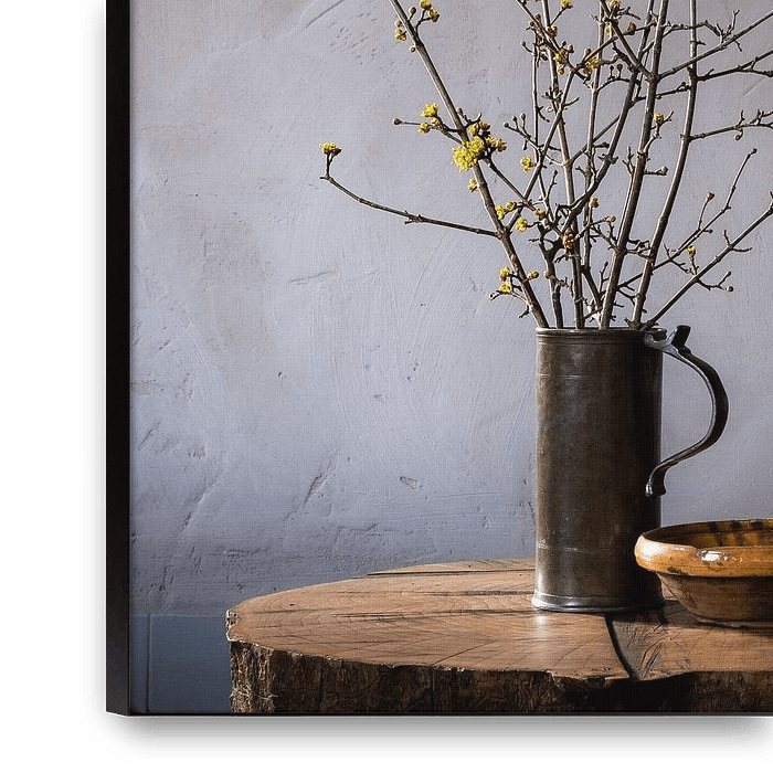 een oud Hollands stilleven met voorjaarsbloesem in een tinnen bierpul, met aardewerk op hout. Voor een sfeerbeeld klik hier: https://www.facebook.com/Affectfotografie/photos/pcb.4202756853072427/4202755363072576/