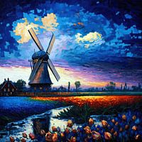 Typisch Hollands tafereel met bloemenvelden,tulpen, een molen en wolkenlucht.