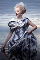Portret van een Nederlandse vrouw in de zee met een Hollandse wolkenlucht tijdens de zonsondergang.
