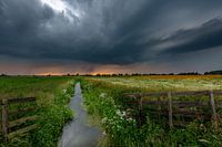 Een typische Hollands landschap tijdens zonsopkomst, met weilanden en donkere wolkenpartijen vanwege de buinen die er aan kwamen.