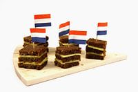 Hollands borrelhapje met kaas en roggebrood op snijplankje op een witte achtergrond