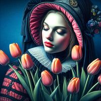 Hoe Nederlands kan een portret zijn. Een Hollandse vrouw met tulpen. In dit portret zien we op een surrealistische manier een Portret van een vrouw met tulpen, het kleurgebruik lijkt ook wel Hollands. de dromerige blik van de vrouw laat haar kijkers denken. Tulpen hoe Hollands kunnen we het hebben.