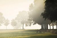 Hollands landschap op een mistige morgen terwijl de zon er extra sfeer inbrengt. Schapen zijn rustig aan het grazen en maken het plaatje compleet.