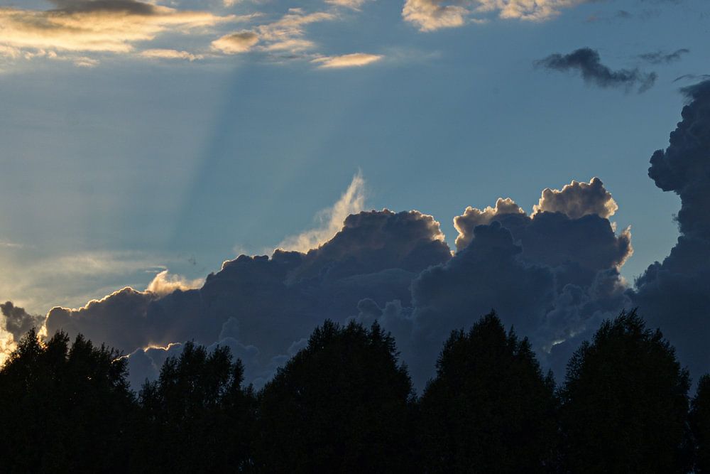 Een prachtige avondlucht waarbij je de zon vanachter de wolken ziet komen op een prachtig Hollands landschap.