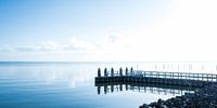 Er heerst een serene rust in deze foto van het IJsselmeer. Het rustige gladde water reflecteert de steiger met zicht op de eindeloze horizon.