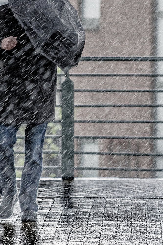 Typisch Nederlands weer. Echter houdt de paraplu alleen zijn hoofd droog.