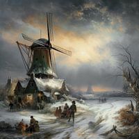 Op het schilderij is een prachtig winterlandschap te zien uit de 18e eeuw. In het tafereel staat een molen. De wieken van de molen zijn gestopt met draaien en er ligt een serene stilte over het landschap. Op het schilderij is verder een bevroren rivier te zien, waarop mensen schaatsen en wandelen in de sneeuw en genieten van de omgeving. In de verte zijn besneeuwde velden en bossen te zien. De bomen zijn bedekt met een laagje sneeuw. De sfeer van het schilderij is kalm en vredig. De rustige stilte van de winter is voelbaar en de schoonheid van het landschap is adembenemend. Het schilderij is een prachtige weergave van het winterseizoen en laat de kijker genieten van de natuurlijke schoonheid van het koude seizoen in de 18e eeuw.