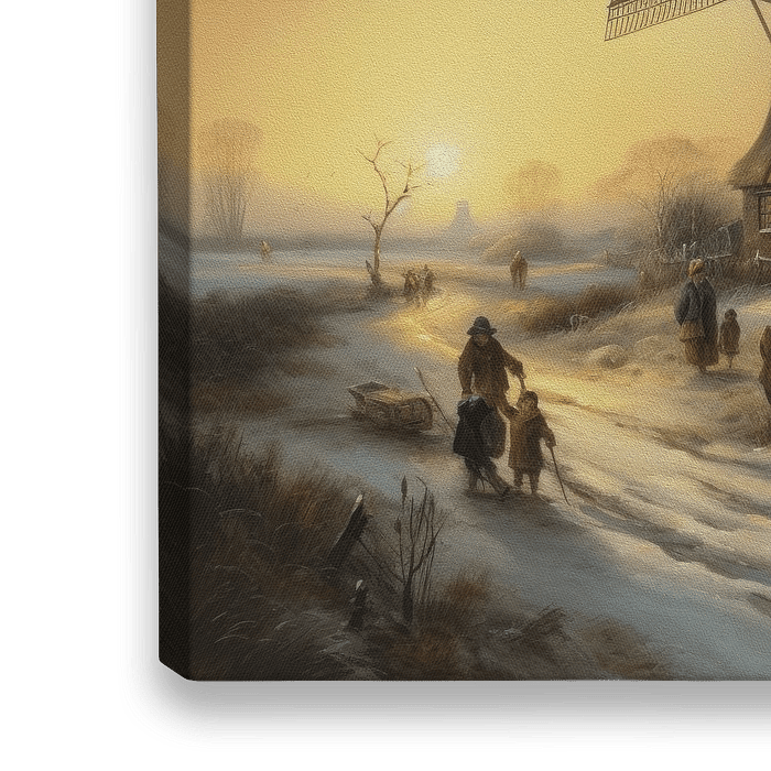 Op het schilderij is een prachtig winterlandschap te zien uit de 18e eeuw. In het tafereel staat een molen. De wieken van de molen zijn gestopt met draaien en er ligt een serene stilte over het landschap. Op het schilderij is verder een bevroren rivier te zien, waarop mensen schaatsen en wandelen in de sneeuw en genieten van de omgeving. In de verte zijn besneeuwde velden en bossen te zien. De bomen zijn bedekt met een laagje sneeuw. De sfeer van het schilderij is kalm en vredig. De rustige stilte van de winter is voelbaar en de schoonheid van het landschap is adembenemend. Het schilderij is een prachtige weergave van het winterseizoen en laat de kijker genieten van de natuurlijke schoonheid van het koude seizoen in de 18e eeuw.