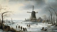 Op het schilderij is een prachtig winterlandschap te zien uit de 18e eeuw. In het tafereel staat een molen. De wieken van de molen zijn gestopt met draaien en er ligt een serene stilte over het landschap. Op het schilderij is verder een bevroren rivier te zien, waarop mensen schaatsen en wandelen in de sneeuw en genieten van de omgeving. In de verte zijn besneeuwde velden en bossen te zien. De bomen zijn bedekt met een laagje sneeuw. De sfeer van het schilderij is kalm en vredig. De rustige stilte van de winter is voelbaar en de schoonheid van het landschap is adembenemend. Het schilderij is een prachtige weergave van het winterseizoen en laat de kijker genieten van de natuurlijke schoonheid van het koude seizoen in de 18e eeuw.