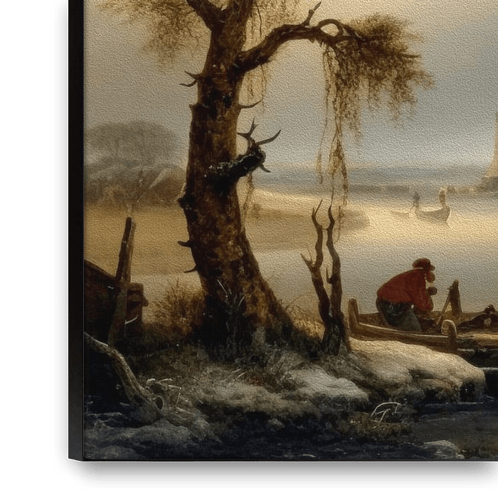 Op het schilderij is een prachtig winterlandschap te zien uit de 18e eeuw. In het tafereel staat een oude boerderij aan een rivier. Er ligt een serene stilte over het landschap. Op het schilderij zijn mensen te zien die genieten van de omgeving. In de verte zijn besneeuwde velden en bossen te zien. De bomen zijn bedekt met een laagje…
