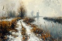 Dit kunstwerk vangt de serene schoonheid van een typisch Nederlands winterlandschap. Met bevroren rivieren, besneeuwde velden en molens, roept het schilderij nostalgie en de charme van een Hollandse winter op. De warme kleuren en gedetailleerde penseelstreken geven een levendig beeld van het dagelijkse leven tijdens de wintermaanden in Nederland. Perfect voor liefhebbers van traditionele Nederlandse kunst en winterse scènes.