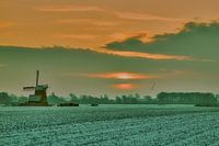 Een beeld van een Hollands winterlandschap in de polder met een oude Hollandse windmolen tijdens een zonsopkomst.