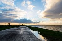vergezicht vanaf een dijk met de ondergaande zon