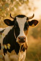 Deze nieuwsgierige zwart-witte koe vangt het zachte gouden zonlicht van een vroege ochtend, omringd door een dromerige waas van bladeren. Een ode aan het landelijke leven en de eenvoudige schoonheid van de natuur.