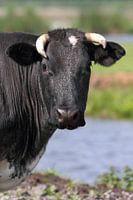 Een Hollandse koe staand in een weiland en in een verticale foto