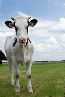 Een Hollandse koe staand in een weiland en in een verticale foto