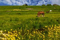Typisch Nederlands landschap onder aan de IJsseldijk met paarden en wilde bloemen op de voorgrond.