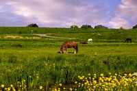 Typisch Nederlands landschap onder aan de IJsseldijk met paarden en wilde bloemen op de voorgrond.