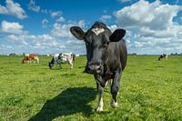 Een Hollandse koe in het weiland met een echte Hollandse lucht. Het groene gras van het weiland, een echt Hollands beeld