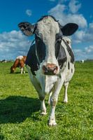 Een nieuwsgierige Hollandse koe in het weiland met een echte Hollandse lucht. Het groene gras van het weiland, een echt Hollands beeld.