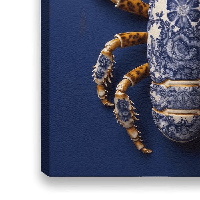 Hollandse kreeft in delfts blauw porcelein op een strak blauwe achtergrond. Subtiele gouden / oranje details.