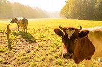 Hollandse lakenvelder koeien in een weiland tijdens de herfstzonsopgang in het Veluwse natuurgebied, Gelderland, Nederland.