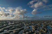Mooie schapenwolken boven het droogvallende land van de Waddenzee in Friesland. Mooie modderhopen en watergeultjes.