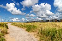 Dit is een echte kustfoto van Katwijk aan zee,met de duinen op de voorgrond en de woningen aan de boulevard.