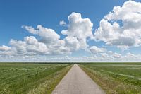 Een mooie Hollandse wolkenlucht boven het platteland bij het plaatsje Hoorn op Terschelling, een van de prachtige Waddeneilanden.