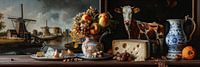 Het Hollandse Oude Meesters Stilleven Panorama is een adembenemend tafereel waarin de essentie van de Nederlandse cultuur tot leven komt. Dit meesterwerk omvat een prachtig landschap met grazende koeien en uitgestrekte groene weiden, geschilderd met de verfijnde precisie van de oude meesters. Temidden van dit idyllische landschap schitteren verleidelijk rijen met ambachtelijk gerijpte kazen, symbool van de rijke zuiveltraditie van Nederland. De warme gloed van het zonlicht streelt over de scène, waardoor elke penseelstreek tot leven komt. Dit panorama vangt de tijdloze charme en het karakter van het Nederlandse platteland op een onvergetelijke manier, een eerbetoon aan het vakmanschap van de oude meesters.