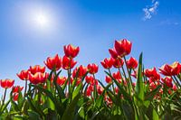 Hollandse rode tulpen onder een zonnetje en een helder blauwe lucht