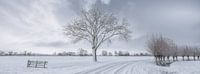 Een prachtig panorama van een winter landschap in de polder bij Noordeloos in Utrecht met besneeuwde velden. Een klassiek Hollands beeld van winter in Nederland