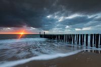 Hollandse wolkenlucht en typische golfbreker van houten palen langs de Zeeuwse kust