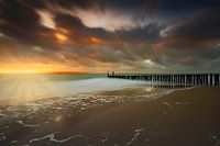 Hollandse wolkenlucht en typische golfbreker van houten palen langs de Zeeuwse kust