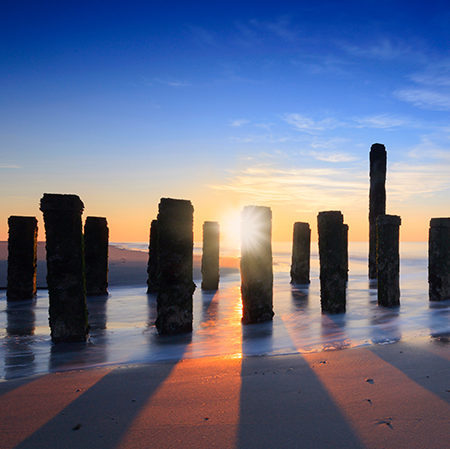 Hollandse wolkenlucht en typische golfbreker van houten palen langs de Zeeuwse kust van gaps photography