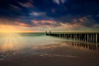 Hollandse wolkenlucht en typische golfbreker van houten palen langs de Zeeuwse kust