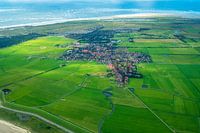 Het dorpje Hollum met vuurtoren Bornrif op het Waddeneiland Ameland gefotografeerd op ongeveer 300 meter hoogte door het raampje van een Cessna 206 van Tessel Air. Luchtfotografie. Deze foto is gemaakt in Augustus 2021.