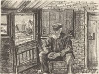 Deze oude Hollumer boer zit in zijn huis met typisch Nederlandse deur en traditionele klederdracht. Op de achtergrond nog enkele huizen of woningen uit het dorp.