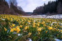 De ontluikende Narcissen en de laatste sneeuw die op de achtergrond stilletjes wegsmelt