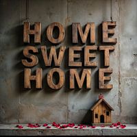 Een verweerde tekst met de woorden *Home Sweet Home* in sierlijke, oude letters hangt tegen een ruwe betonnen muur. De verf is hier en daar afgebladderd, en de achtergrond heeft een verweerde, vintage uitstraling. De muur toont scheuren en vlekken, wat het geheel een robuuste, industriële sfeer geeft.