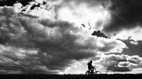 Fiesters op de banddijk nabij Werkendam. De lucht was dreigend en de witte wolken gaven een sterk contrast met het blauw van de lucht. De fietsers hadden het niet makkelijk met de wind en ploegden dapper verder. Door zelf onderaan de dijk een heel laag standpunt in te nemen kon ik ervoor zorgen dat er zoveel mogelijk lucht in beeld zou komen.